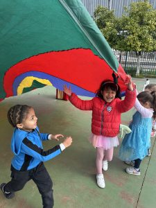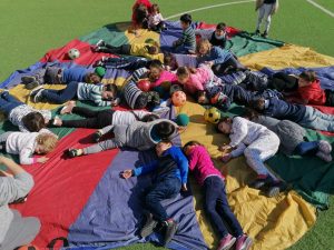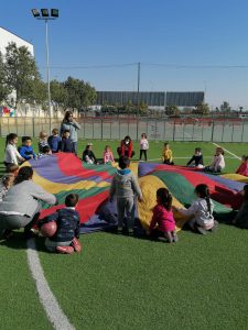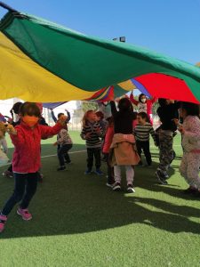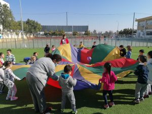 Este centro aboga por la inclusión de todo alumnado, es por esto por lo que en este día se ha desarrollado una sesión de psicomotricidad en la que, además de participar el alumnado de la etapa de Educación Infantil, también lo han hecho el alumno y alumna del aula celeste. La actividad se ha desarrollado en el patio, haciendo uso de un paracaídas con el que todo el alumnado ha participado unidos y con diversión.