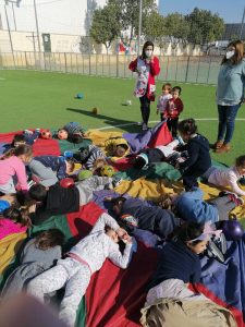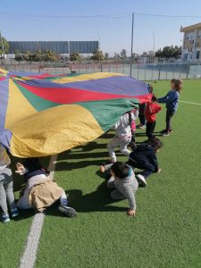 Este centro aboga por la inclusión de todo alumnado, es por esto por lo que en este día se ha desarrollado una sesión de psicomotricidad en la que, además de participar el alumnado de la etapa de Educación Infantil, también lo han hecho el alumno y alumna del aula celeste. La actividad se ha desarrollado en el patio, haciendo uso de un paracaídas con el que todo el alumnado ha participado unidos y con diversión.
