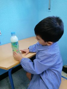 En clase hemos elaborado botellas sensoriales para utilizarlas en los momentos que buscamos la relajación personal. Para ello se ha utilizado una botella de plástico, purpurina, agua y un poco de pegamento transparente.