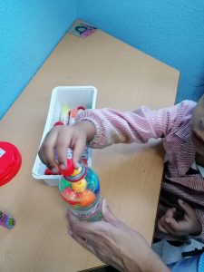 Cada semana intentamos desarrollar una sesión de musicoterapia, para que el alumnado disfrute de este momento y reacciones al escuchar la música y los diferentes sonidos de los instrumentos (tambor, pandereta, campaña, palo de lluvia, cascabeles y castañuelas)